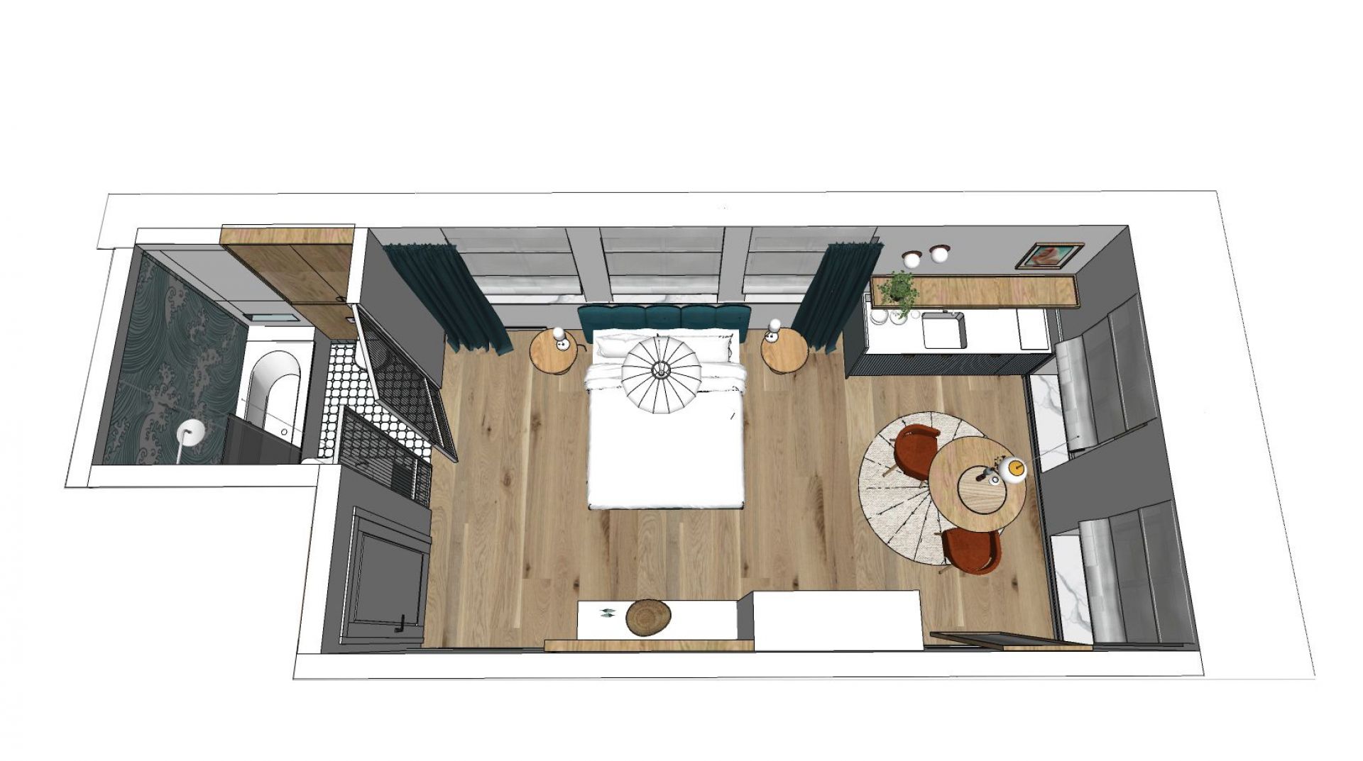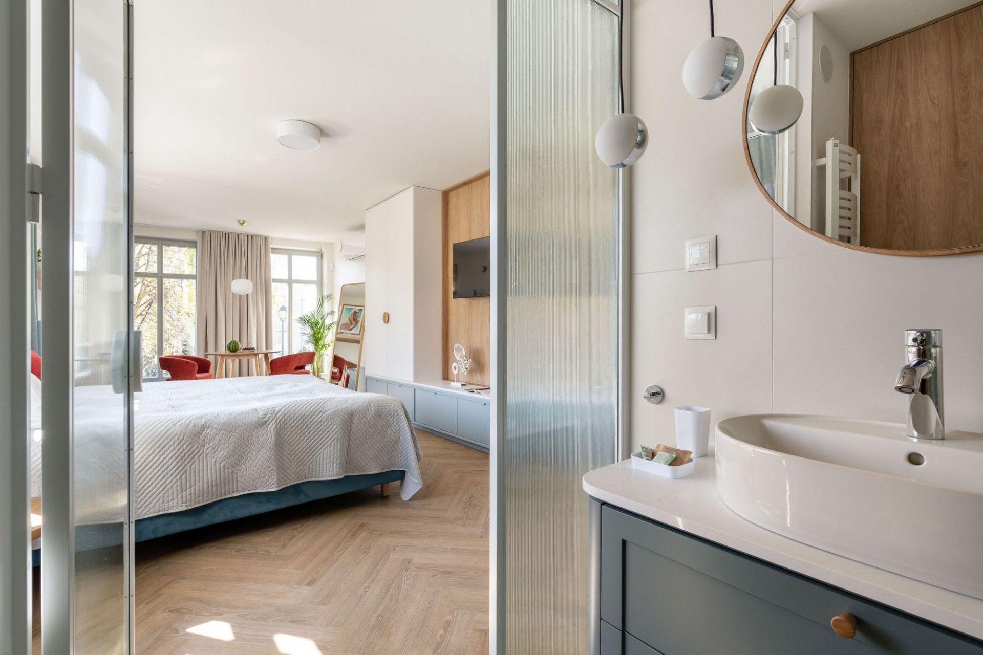 Apartament Baltic Wave 3 to niezwykle jasne i przestronne studio - wprost idealne dla par. Posiada wygodne łóżko 2-osobowe (180x200cm), łazienkę wyposażoną w wannę z funkcją prysznica, a także stylowy aneks kuchenny z częścią jadalną. Przepiękne, duże okna są największym atutem tego mieszkania i już od progu witają światłem, a także zapewniają piękny widok na okoliczne kamienice.